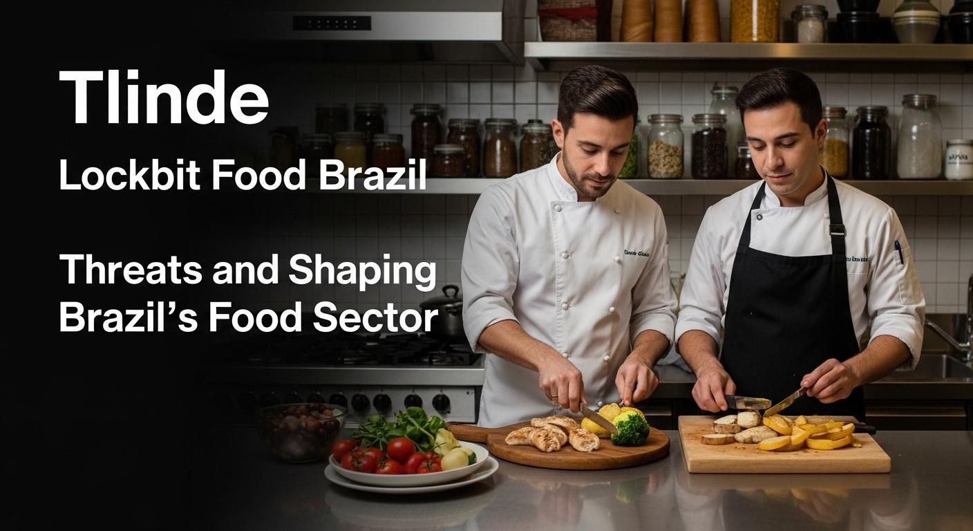 Illustration of ransomware risk to the Brazilian food industry, with factory icons and LockBit symbolism.